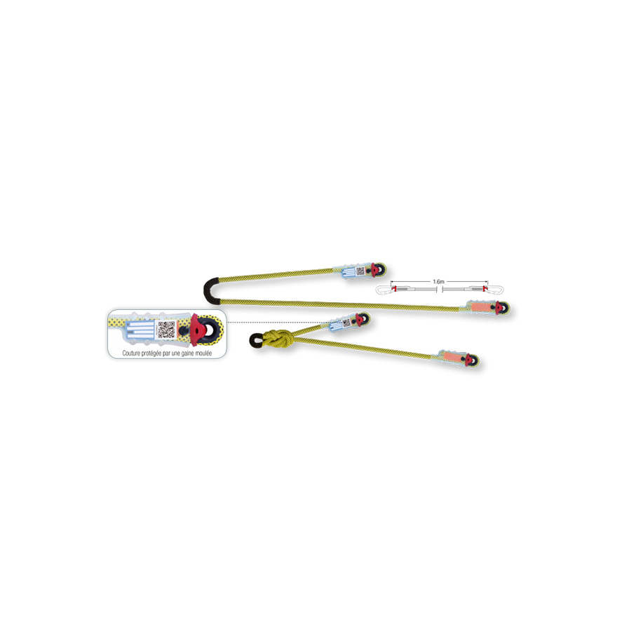 用于作业限制的缝合终端动力绳挽索,其动力特性要优于传统静力绳挽索。根据自己的需要打8字结形成V形不对称挽索,挽索同时符合EN354标准。
