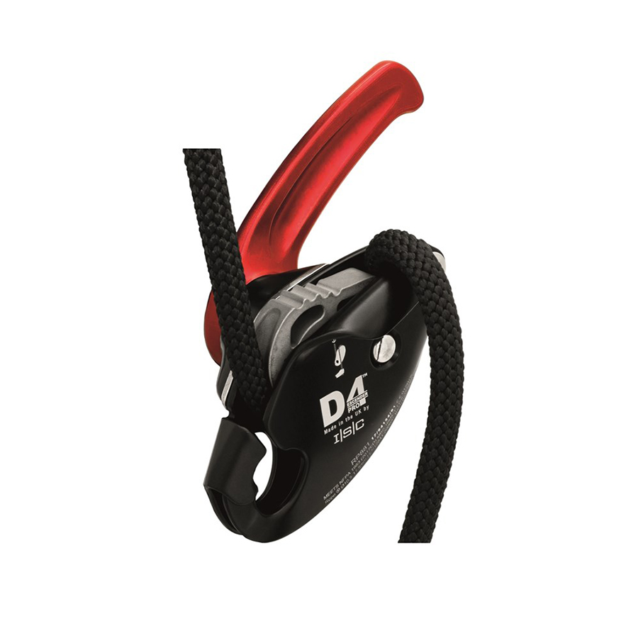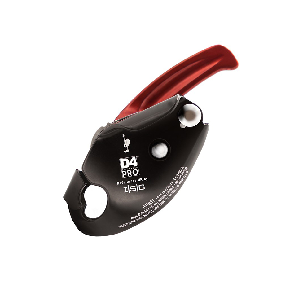 ISC D4 PRO 专业版下降器,和普通版本的D4相比,最大的不同是D4 RPO没有防慌乱功能,这样D4就能更轻松的在低拉力情况下放出绳索,能轻松进行高速下降(警告:高速下降会导致绳皮融化,甚至导致受伤或死亡)。所以PRO版本的D4只适合有经验的人员使用。它的其他特点与普通版D4相同。为了与普通版区分,D4的两个侧板均采用黑色镀层,把手采用暗红色。