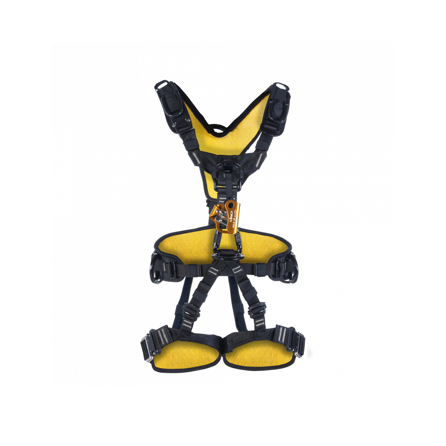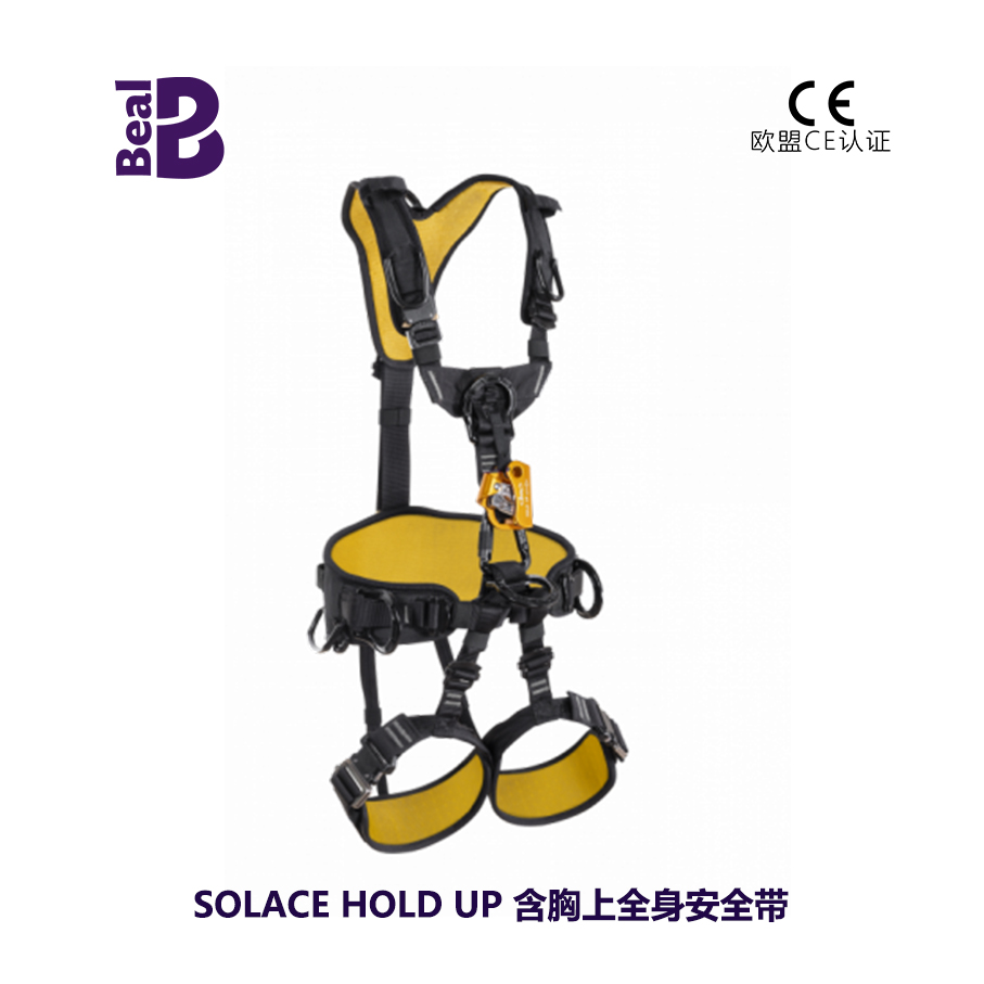 工作定位,悬吊作业及防坠落安全带,配有胸式上升器进行绳索上升,HOLD UP与使用者的身体保持平行能让绳索顺滑通过设备。舒适性:腿环前面配有可调节带,更好地适应空中姿态。在前侧区域,肩带与腹部的连接点向两侧拉伸,为颈部留出足够的活动空间,这个空隙由于采用了较窄的扁带而进一步得到增强,腿环衬垫可进行滑动位置调节,可调节的腿环位置固定带位于腰带后侧与腿环之间。宽阔的腰带一直延伸至前腰上侧,提供极佳的悬吊支撑。人体工程学:优化后的Y型肩带更便于后背连接点的位置,肩带一侧配有快速连接卡扣。当需要快速穿脱时,可以直接打开此卡扣而无需调节安全带,腿环配有两个快开卡扣,可拆卸胸升松紧固定带可令胸式上升器始终与安全带之间处于垂直位置,FLAT LINK锁扣可以快速将腰带与肩带进行连接,并且兼容HOLD UP胸式上升器。水平的连接点能保证扁带正常受力。附件:每个肩带上,都有一个可重复使用的保险丝环,用来存放止坠挽索的锁扣。当发生坠落时,存储的挽索将会释放从而使止坠挽索能够不间断的吸收能量,每个肩带上也配有一个魔术搭扣用来固定防坠落挽索或无线电对讲机,5个装备环,6个迷你小装备挂环可以兼容WorkStation系列工具包。可追踪性:腰带小窗口识别位置可采用二维码添加个人信息